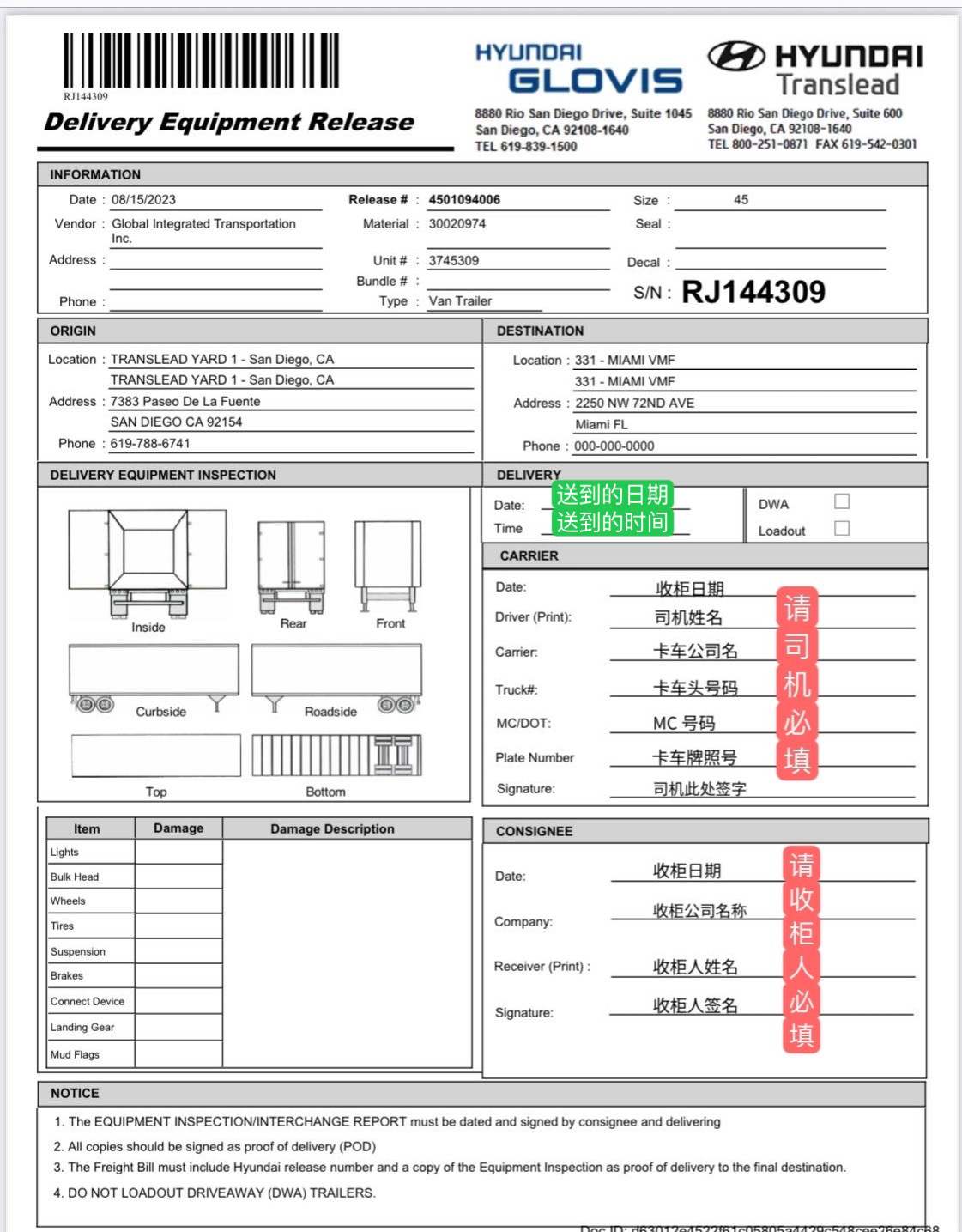 新表填单新加了一栏Driver Cell:就是写出提新柜子司机师傅的手机号。