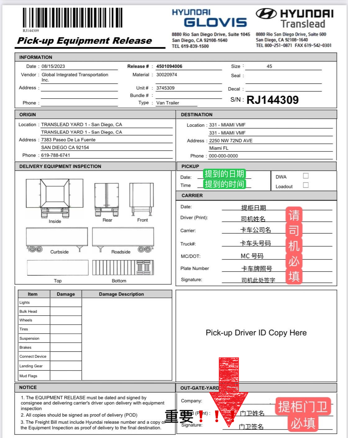重要事情说三遍:当你提出空柜并得到签字,请将提柜单立刻发给调度员,当你送完空柜并得到签字,也请立刻把送柜单发给调度员进行柜单电脑系统更新,便于审计。两个单子,谢谢!